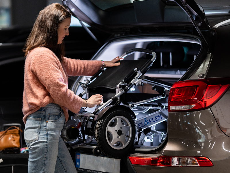 The Eloflex fits in all types of cars. Now you can travel with a friend, take a regular taxi, or rent a car without worrying about hassles with your electric wheelchair. The low weight makes it easy to load into your own car.
