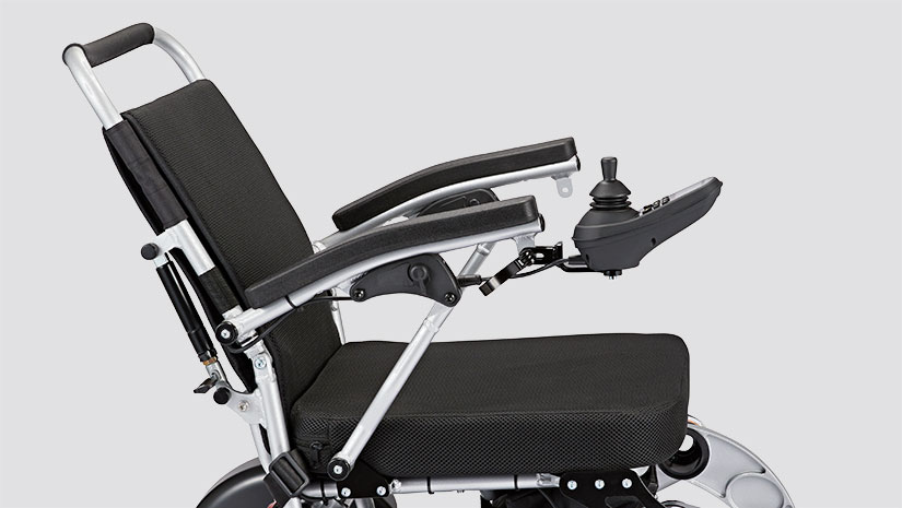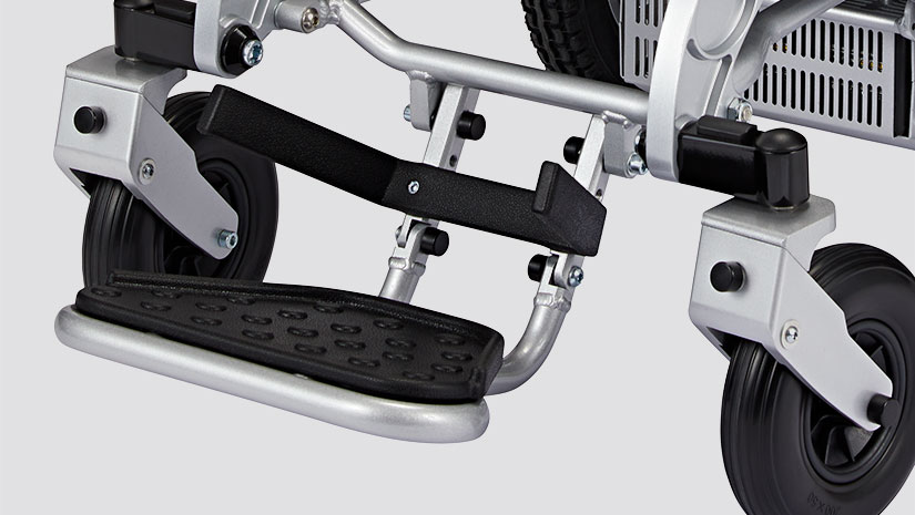 Careful attention has been paid to ergonomics and usability. The smart joystick mount folds down, bringing you closer to the edge of the table, and the footrest neatly tucks away when sitting or standing. Large air-inflated rear wheels and spring-loaded cushioning in the front axle ensure good shock absorption, even on uneven surfaces.