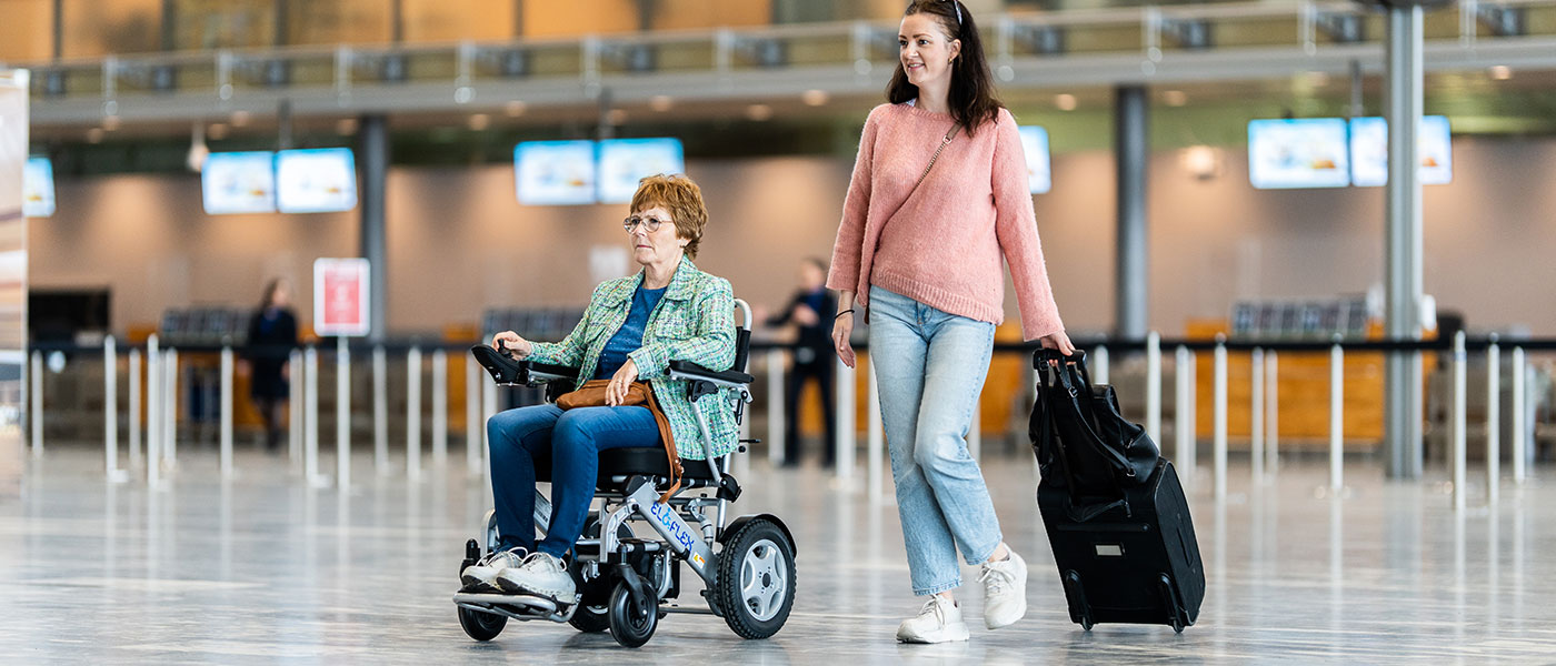 When booking your trip, make sure to indicate that you want to bring a powered wheelchair on the flight. You’ll then receive a set of follow-up questions from the airline, including information about the weight and size of the power wheelchair, the type, weight and output of the batteries. You can find answers to these questions in the documents below. Upon arrival at the airport, go to the regular check-in desk. They will coordinate with the airport assistance service to provide you with a manual wheelchair for use at the airport. After check-in, bring your Eloflex to the special baggage claim area where they will handle the transportation of the power wheelchair to the plane. If you do not have a protective bag, we recommend that you rent one at the airport.