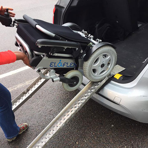A loading ramp serves as a valuable tool for safely loading an Eloflex into your car, especially if you find heavy lifting challenging. It allows you to drive your Eloflex up the ramp in the folded position using the chair's motors. There are many different types of ramps: long, short, wide and narrow... Eloflex offers two different models, which can be found in our accessories section. In the image below, we present a solution sent to us by one of our users that worked quite well.