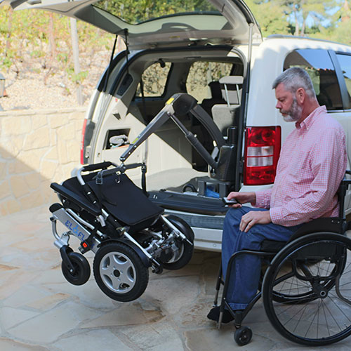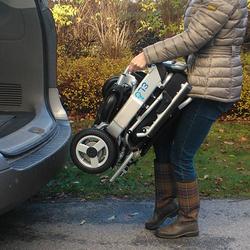 A method with lower grip for shorter people. Utilized the wheels to roll the chair into the car’s trunk, making sure to to disengage the motors before lifting.